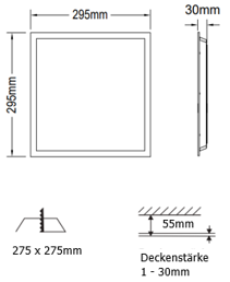 LIGHTSCAPE BACKLIGHT Deckeneinbauleuchte mit SMD-LED Flachenhinterleuchtung, Leuchtenrahmen Aluminium, Gehäuse Stahlblech, Kühlung passiv / wartungsfrei (ohne Ventilator- und Membrantechnik), Oberfläche pulverbeschichtet weiß Feinstruktur, Slimline-Rahmen mit nur 15 mm Breite, inkl. Reflektionsfolie zur Wirkungsgradoptimierung,, Oberfläche weiß pulverbeschichtet, Farbtemperatur 4000 K, Systemleistung 15,39 W, LED-Netzteil wahlweise schaltbar oder DALI dimmbar, separat, Leuchten-Lichtstrom 1950  lm, Farbwiedergabeindex Ra > 80, mittlere Lebensdauer 50.000 H, Leuchtenabdeckung in Sandwich-Bauweise: Hochleistungs-Reflektionsfolie, Diffuser PS, spiegelungsfrei, UGR < 19, , Abmessung 295 x 295 mm, Deckenausschnitt  275 x 275 mm, Einbautiefe 55 mm, Schutzklasse I, Schutzart IP40, Betriebsgerät nach EU Ökodesign-Anforderungen austauschbar