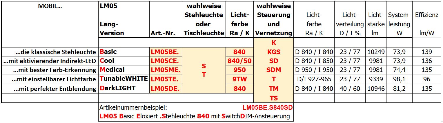 MOBIL Arbeitsplatz-Stehleuchte LM05 mit direktem und indirektem Lichtaustritt, wahlweise in den Versionen BASIC / COOL / MEDICAL / TUNABLE oder DARK, Leuchtenkörper scharfkantiges Aluminium-Strangpressprofil, Kühlung passiv / wartungsfrei (ohne Ventilator- und Membrantechnik), Oberfläche eloxiert, gebürstet, Tridonic-LED, Lichttechnische Daten lt. Tabelle, MacAdam 3, mittlere Lebensdauer 72.000 H (L80/B10), LED-Netzteil wahlweise schaltbar oder dimmbar, Abdeckung direkt Mikroprismenscheibe, Acryl, BAP-tauglich (UGR < 19), indirekt Acrylscheibe klar, Abmessung Leuchte H = 2030 mm, Ausladung = 1700 mm, leuchtende Höhe = 1950 mm, leuchtende Länge = 1400 mm, Schutzklasse I, Schutzart IP20, massiver Standfuß für höchste Kippsicherheit, mit Aussparung für objektnahe Platzierung, Gewicht 15100 g, inkl. Kabel schwarz L = 2500 mm mit SchuKo-Stecker, Leuchte nach EU Ökodesign-Anforderungen reparaturfähig, LEDs mit Cradle2Cradle Nachhaltigkeitszertifikat
